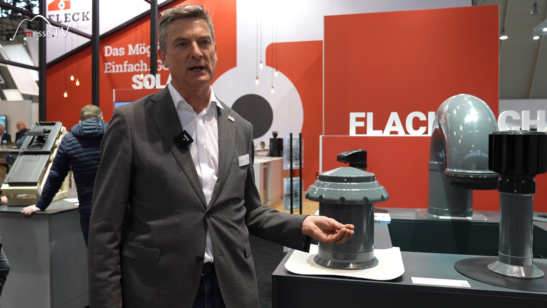 An der Rückseite des Messestandes demonstriert FLECK ein neues, komplett aus recycelten Rohstoffen hergestelltes Walzblei-Ersatzprodukt. Der Basis-Rohstoff stammt aus Verbundglas, welches mit einer sehr hochwertigen Folie verarbeitet wird um Produkte für Dachabdichtungen herzustellen. Auf den Dachpfannen befinden sich diverse Durchgangsmöglichkeiten, um Kabel und Leitungen durchzuführen. Auch für große Leitungen und horizontale Dachdurchführungen ist dies machbar. Was dieses System von denjenigen der Mitbewerber abhebt, ist, dass beim System von FLECK die benachbarten Dachpfannen nicht bearbeitet werden müssen, denn das Unternehmen bildet die Original Dachpfannen nach und macht daraus kleine und große Lüfter und Durchdringungen. Beeindruckend zeigt ein sehr großer Zwangslüfter mit Rotor, der bereits bei 1m/sec anläuft und dann mit Unterdruck aus der Luftkammer im darunterliegenden Flachdachbereich die Luft zieht. Kombiniert man dieses Teil mit einem Entspannungslüfter oder einem normalen Kaltablüfter können diese Bereiche langfristig trocken gehalten werden.