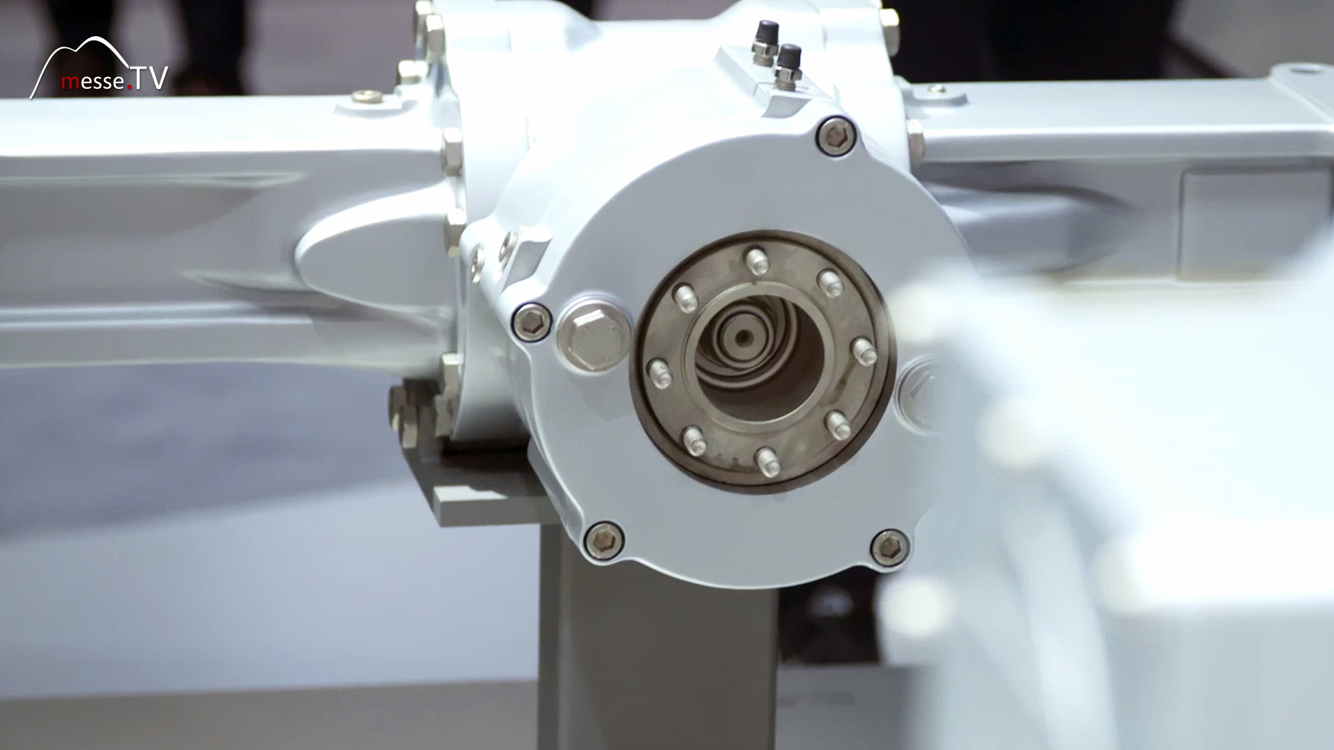 ZF Friedrichshafen shows here the electrified driveline of a compact loader consisting of two conventional axles and the new three-shaft transmission. In the driveline you can see an electric motor with a continuous output of 20 KW and a peak output of 36 KW.