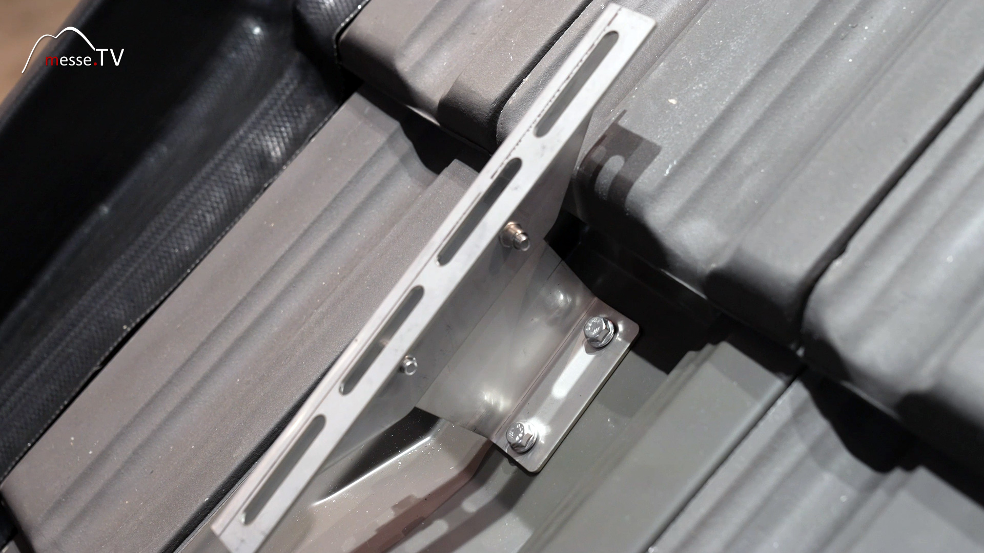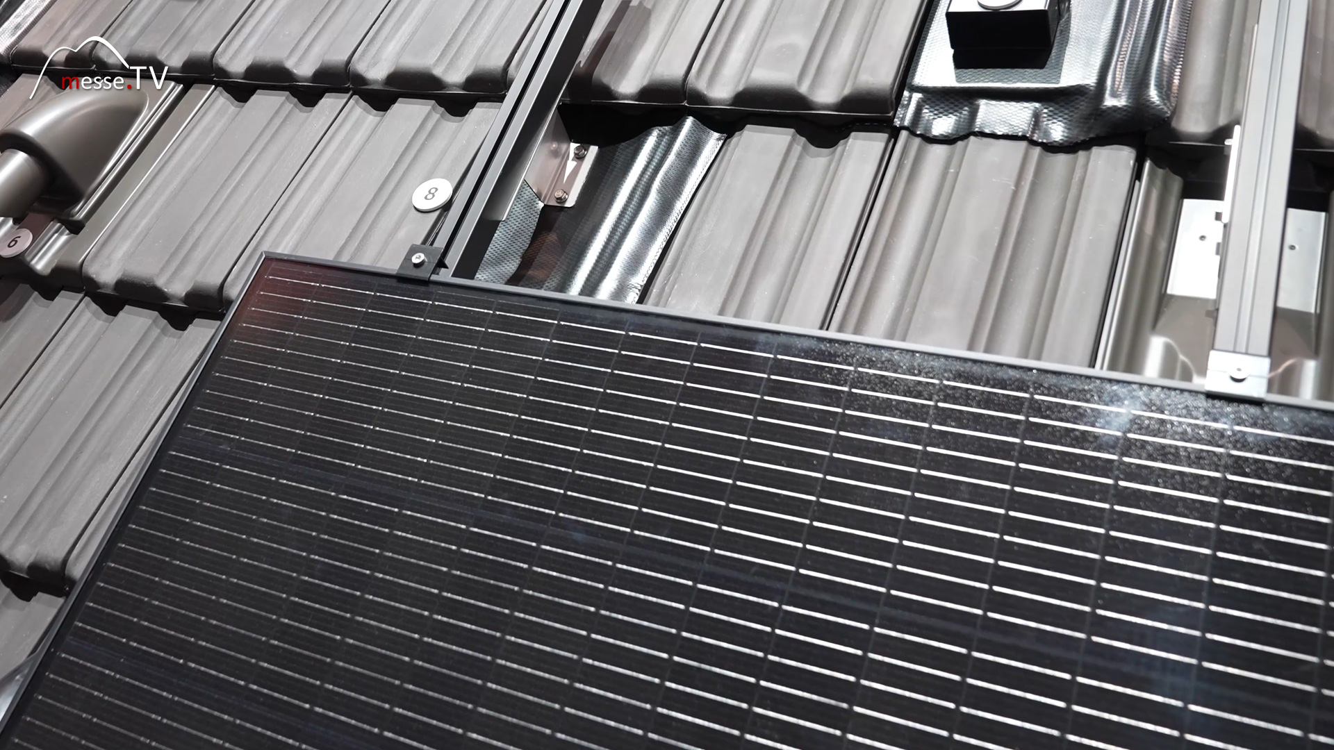 Installation solutions for solar, photovoltaic and solar thermal systems are demonstrated on a small roof model. FLECK specializes in the reproduction of roof tiles, which are equipped with the corresponding support systems. This makes it possible to mount almost any rail system on these roof tiles and thus make the modules easy to fix. FLECK offers over 250 roof tile models. The special thing about it is that it can be installed independently of the rafters, i.e. it is not dependent on the rafter fields. The FLECK method goes between the rafter bays and can therefore pull the supports far apart. This is particularly good for the horizontal installation of modules, as the roof tiles can be placed where the modules are clamped. Another positive aspect is that this enables a very flat structure. In addition, the whole thing can be protected by a PV bird stop, which prevents cavity-nesting birds from going under the system. In detail, we also see a solar support pan without a rail mounting system.