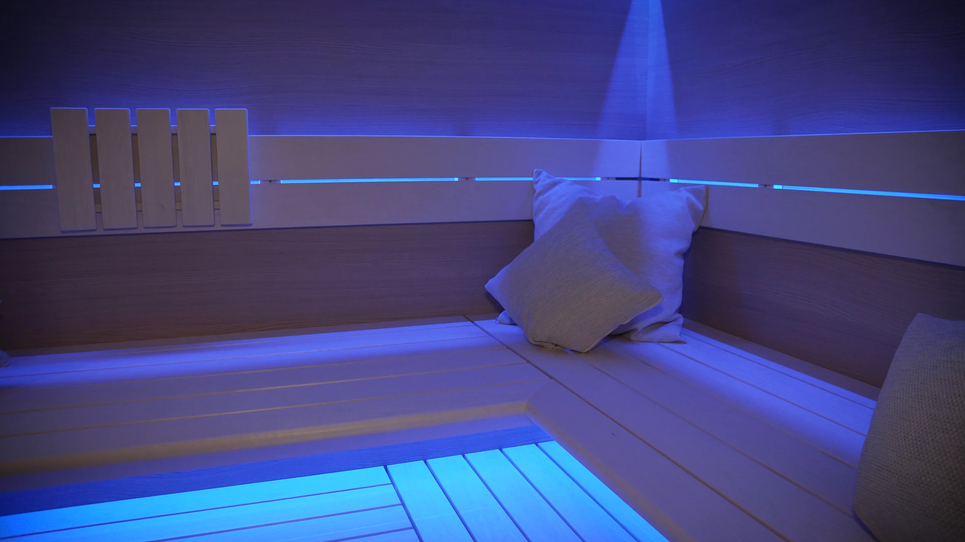 The trade fair highlight from Wärmegrad presents a newly developed sauna model that impresses with its fresh and modern design. The new interior cladding ensures an appealing look and a pleasant feeling of space. The linear and smooth design creates a harmonious atmosphere that invites you to relax. Particularly noteworthy is the spacious bed, which is ideal for relaxing moments after a sauna session. This comfortable design is complemented by the stylish lighting, which makes it possible to adjust the color scheme to suit individual preferences.