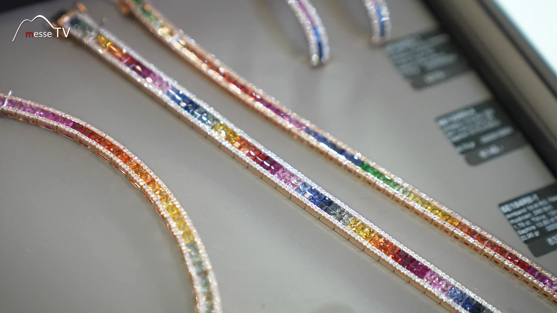 Diamond Group sees the target group for these extraordinary, cheerful pieces of jewelry as women who already have a basic set of solitaire, memoire and eternity pieces and now want to afford something out of the ordinary. In fact, today's woman is no longer necessarily dependent on gifts; she is happy to buy the jewelry she wants to wear herself. Pieces of jewelry from the Rainbow collection, as presented at the fair, cost between 15,000 and 30,000 euros. However, the collection is also available for everyday wear in more discreet designs in lower price ranges.