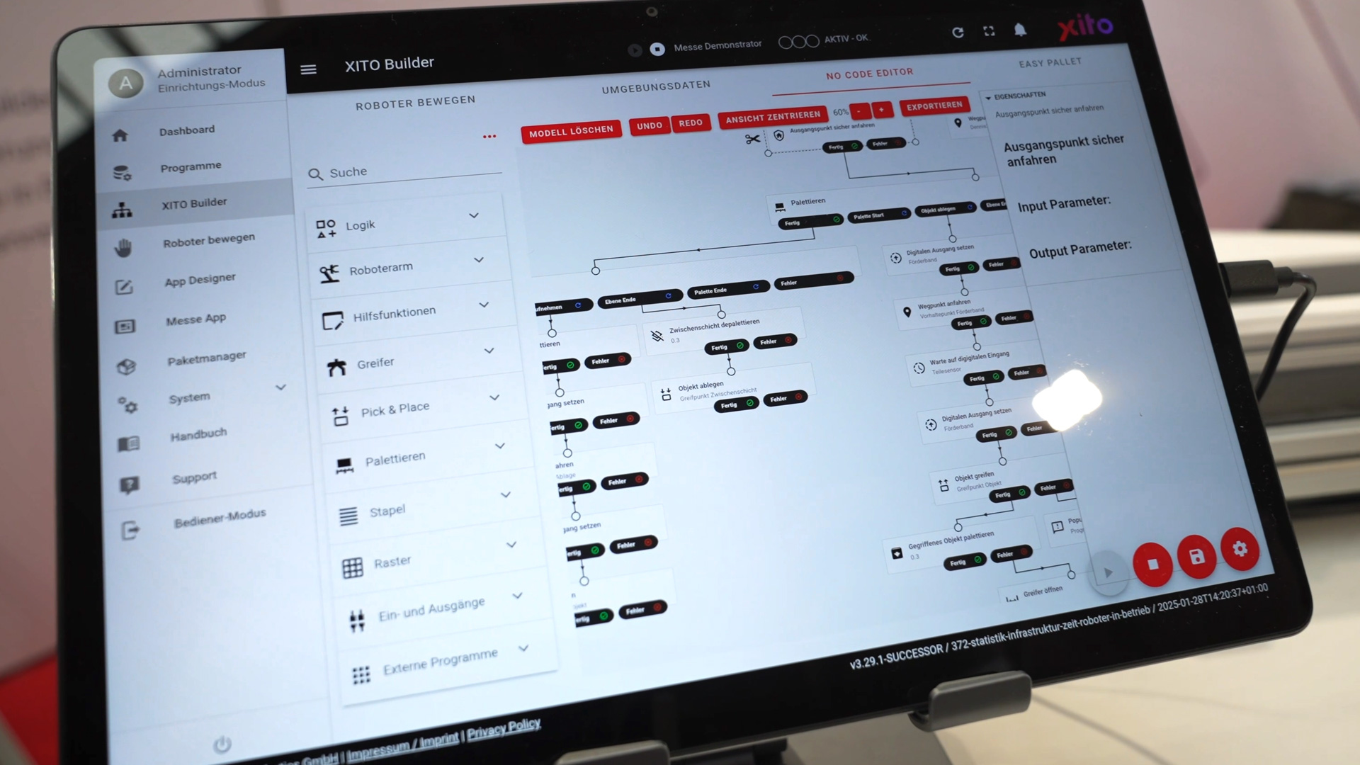 Planning is followed by implementation - and this is where XITO Builder sets new standards in the simple control and configuration of robots. With a no-code interface, robotic processes can be defined by simply clicking together building blocks without having to write a single line of code. This visual programming language enables even beginners to program complex processes such as gripping, positioning, depositing or palletizing intuitively. Predefined logic blocks ensure that every movement runs efficiently and error-free without the user having to delve deep into programming logic. The XITO Builder is a revolutionary solution, especially for small companies or manufacturing companies that are dealing with automation for the first time, as it removes high barriers to entry and makes it possible to get started with automation after just a short time.